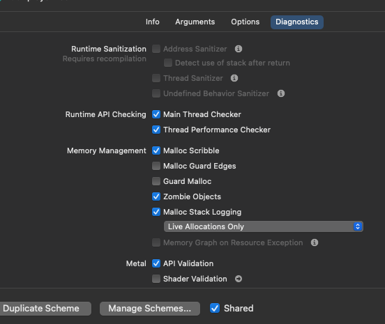 - Run ->[Diagnostics] 탭 -> [Zombie Objects] 체크