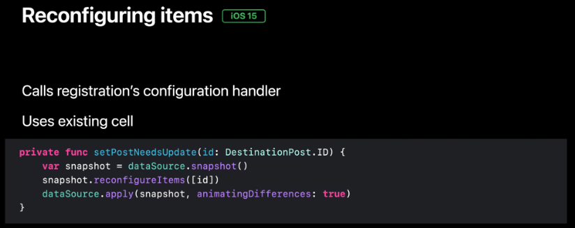iOS 15에서는 DiffableDatasource 에 표시되는 셀의 내용을 쉽게 업데이트할 수 있는 reconfigureItems 메서드가 제공됨. 메서드에 관한 자세한 내용은 아래에 이어짐.