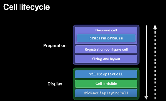 셀의 라이프 사이클은 아래 이미지와 같이 dequeue 한 후 prepareForReuse 에서 초기화 된 후 다시 register와 configure 한 후에 셀 크기에 맞게 화면에 표시됨.