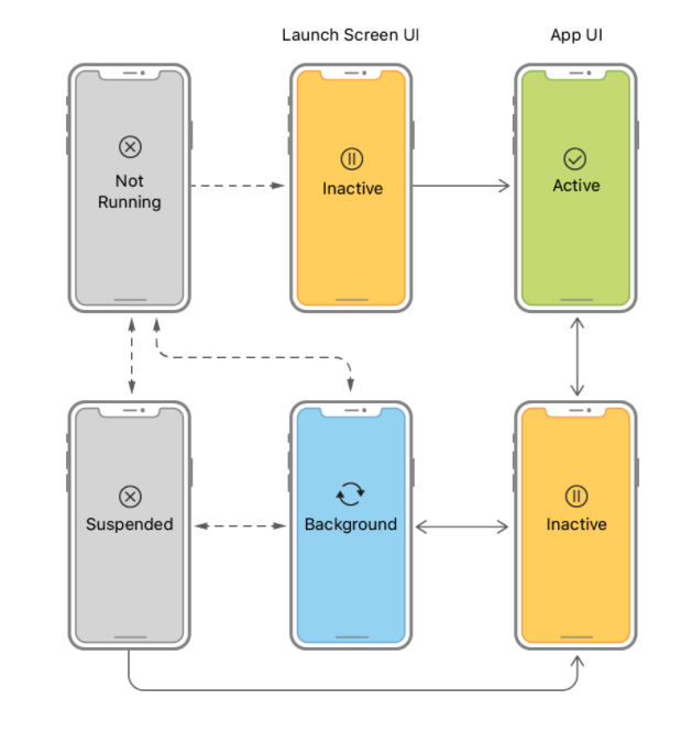 아래 그림은 앱 델리게이트 객체와 관련된 상태 전환을 보여준다. 앱 실행 후, 시스템은 UI가 화면에 표시되는 여부에 따라 앱을 비활성화 또는 백그라운드 상태로 둔다. 포그라운드 상태로 시작할 때 시스템은 앱을 자동으로 활성화 상태로 전환한다. 그 후, 앱의 상태는 앱이 종료 될 때까지 활성 그리고 백그라운드 상태 사이에서 변동한다.