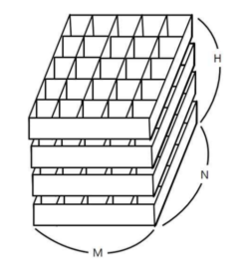 첫 줄에는 상자의 크기를 나타내는 두 정수 M,N과 쌓아올려지는 상자의 수를 나타내는 H가 주어진다. M은 상자의 가로 칸의 수, N은 상자의 세로 칸의 수를 나타낸다. 단, 2 ≤ M ≤ 100, 2 ≤ N ≤ 100,