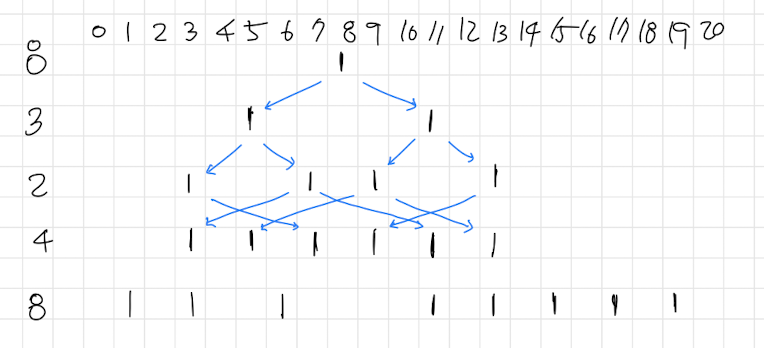 위 그림과 같이 처음에 dp[0][8]을 시작으로 다음 수인 3을 뺀 결과와 더한 결과가 0보다 크거나 같고 20보다 작거나 같으면 dp에 값을 저장한다. 이후는 같은 과정으로 진행하고 마지막 수에 해당하는 경우의 수를 출력한다.