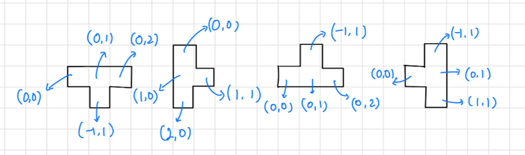 모든 도형을 일일이 회전하고 싶지 않아서 고민을 하다가 인터넷에서 접근 방법만 확인하고 풀었다.