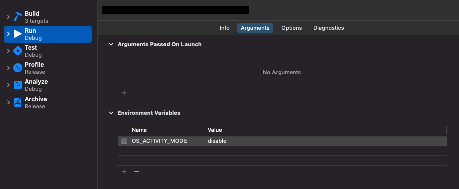 위 그림에서 Environment Variables에 + 버튼을 누르고 Name은 OS_ACTIVITY_MODE Value는 disable을 입력합니다.