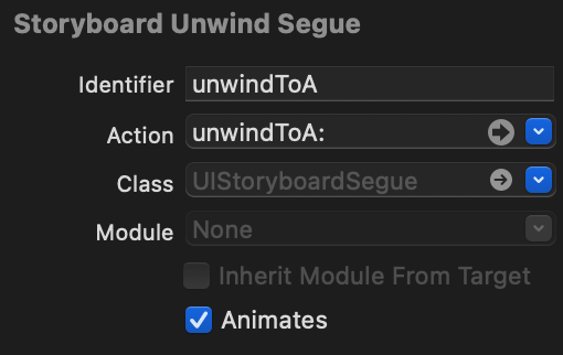 @IBAction func unwindToA(_ segue: UIStoryboardSegue) {
