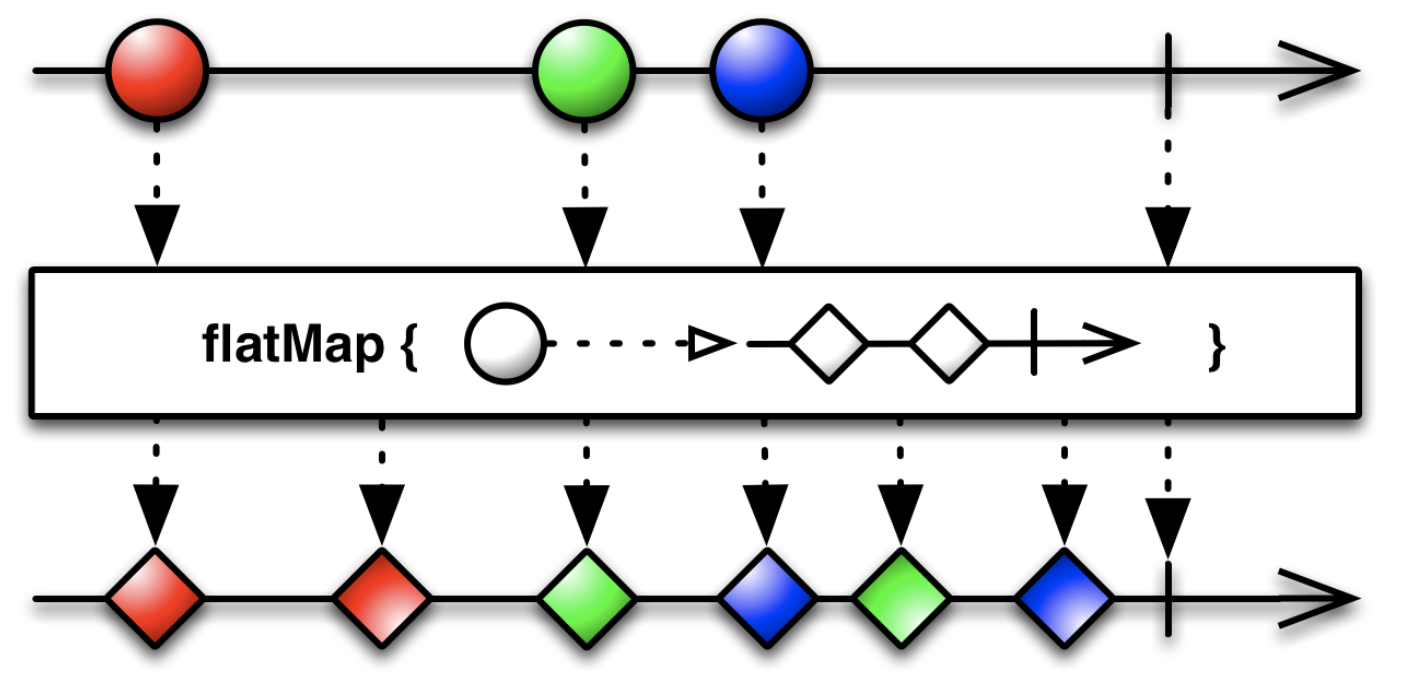 Observable에서 방출된 각각의 요소를 Observable로 변환하고 이들을 결합하여 하나의 새로운 Observable로 만들어 방출한다.