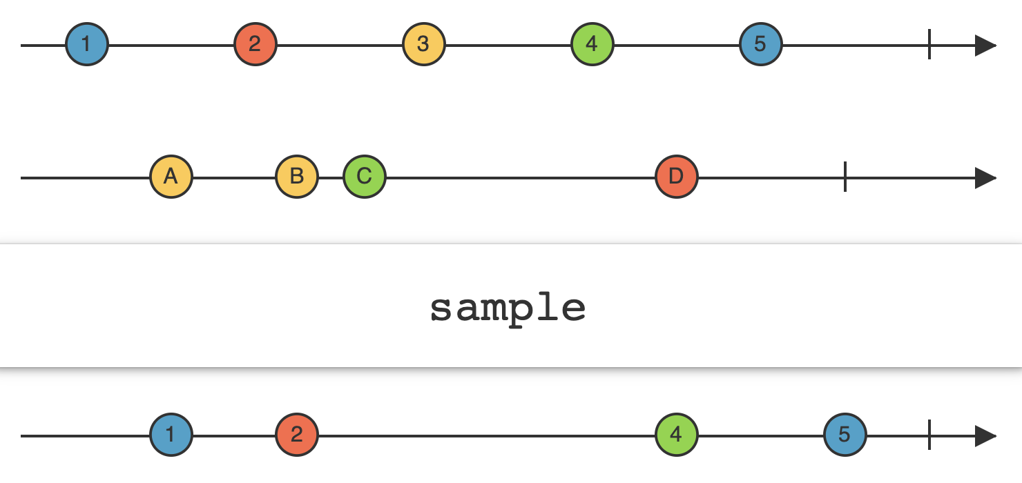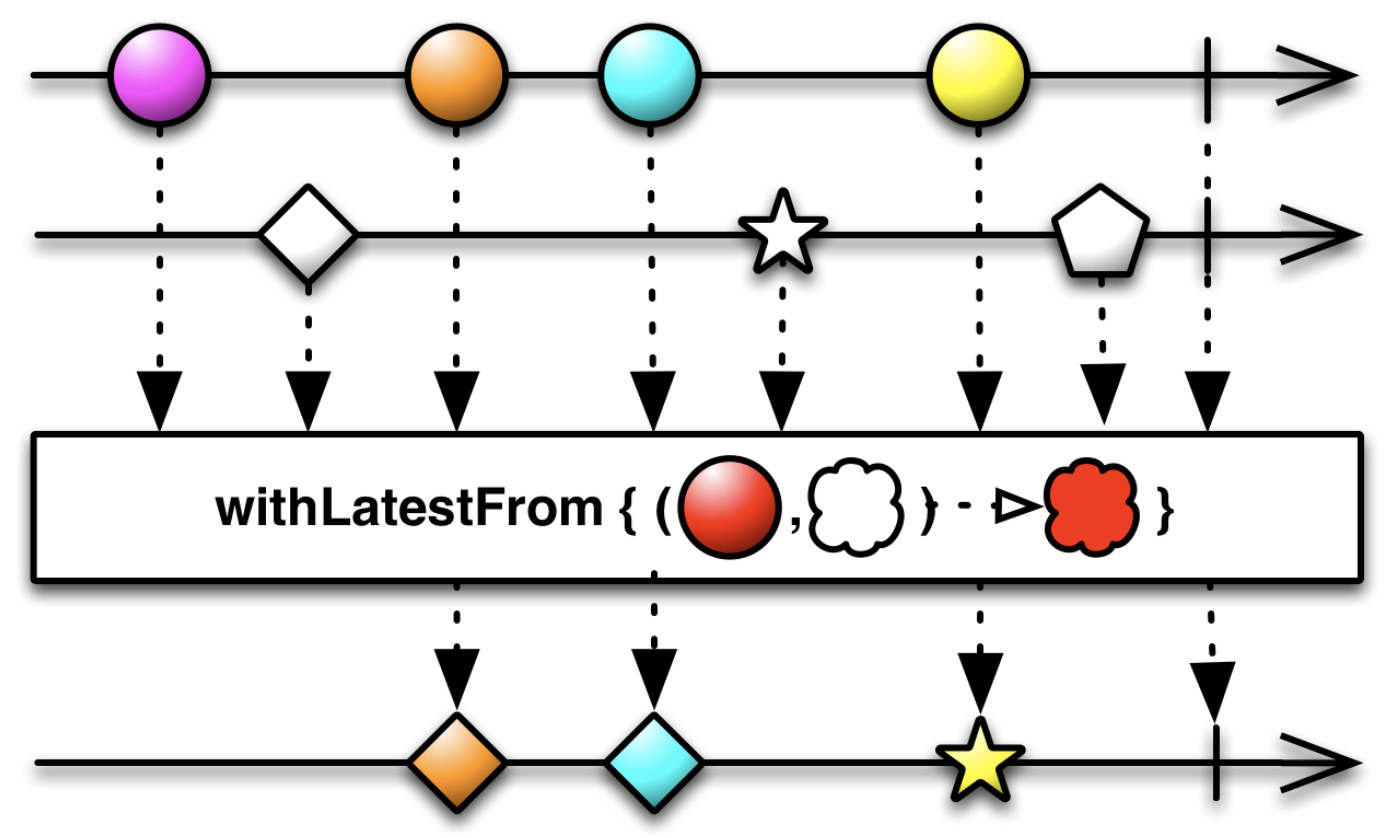 withLatestFrom과 동작이 비슷하지만, Trigger 역할을 하는 Observable이 여러 번 요소를 방출해도 한 번만 방출한다.