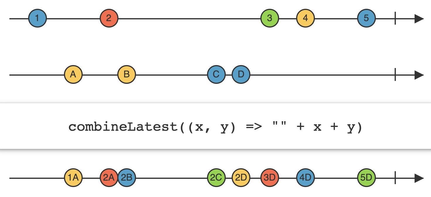 결합된 스트림은 각각의 내부 스트림들이 모두 새로운 이벤트를 방출할 때까지 기다린 후 새로 결합하여 요소를 방출한다.