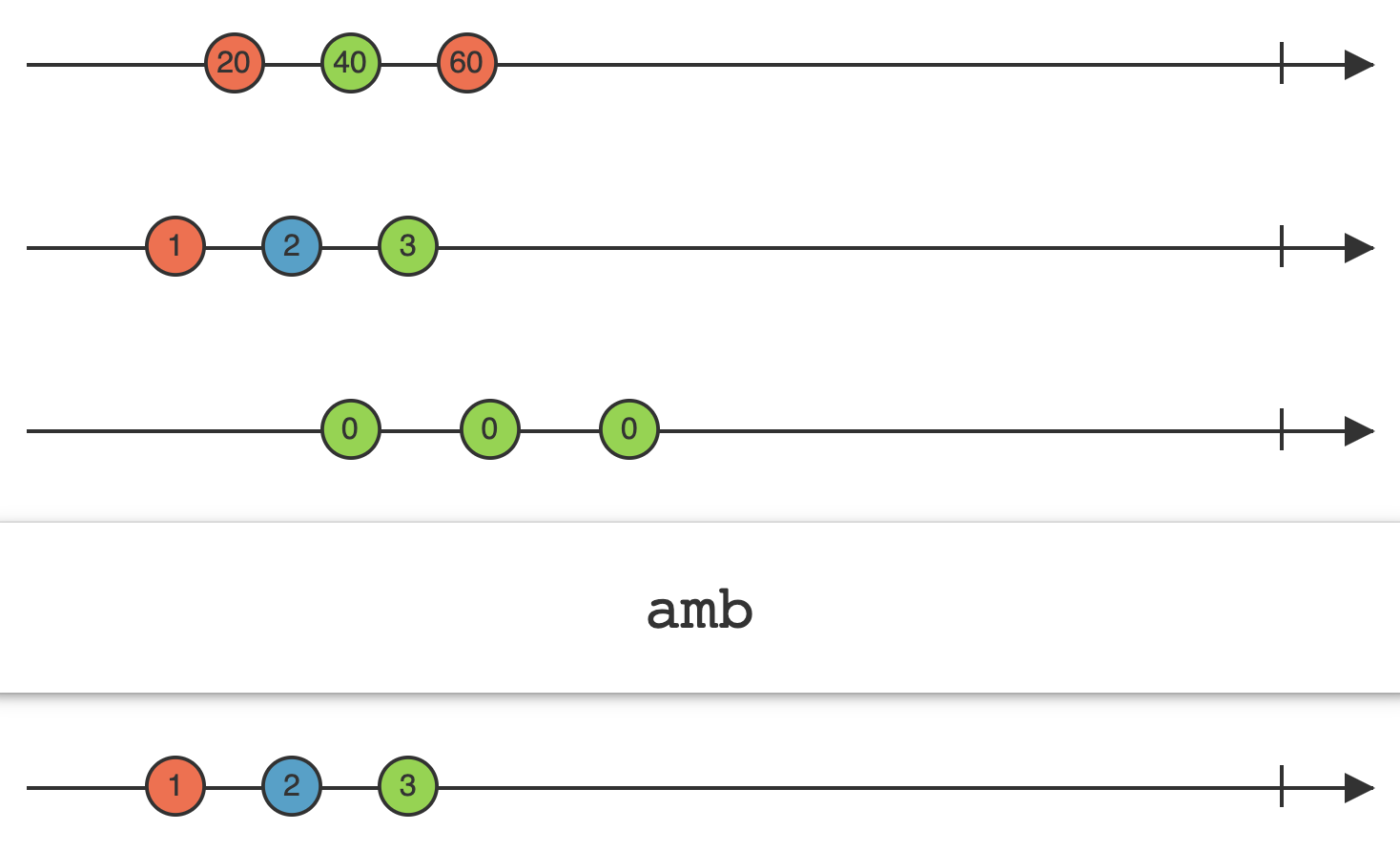 두 개의 스트림 중 먼저 요소를 방출하는 스트림만 방출되게 한다. (다른 스트림의 요소 방출은 무시한다.)